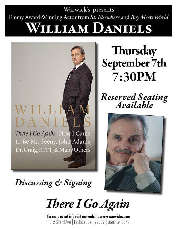 William Daniels, acclaimed for such roles as Mr. Feeny on Boy Meets World and KITT in Knight Rider, will be at Warwick’s Books on Thursday, September 7, 2017 at 7:30 PM signing copies of his book There I Go Again, a celebrity memoir like no other, revealing the life of a man whose acting career has been so rich that millions of Americans know his face even while they might not recognize his name.