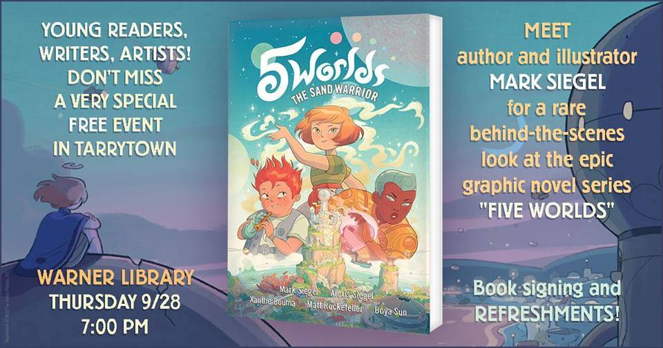Author/illustrator Mark Siegel appears at the Warner Library for a rare look behind-the-scenes of the graphic novel series 5 WORLDS on Thursday, September 28th at 7:00 PM.