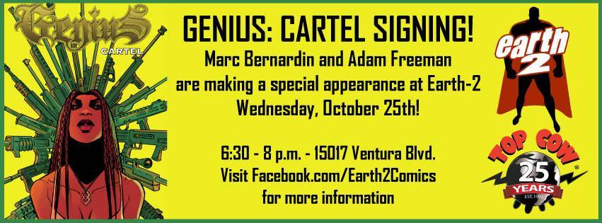 Writers Marc Bernardin (Castle Rock, Static Shock, Fatman on Batman) and Adam Freeman (Castle Rock, Alphas, X-Men Origins: Nightcrawler, The Authority, The Highwaymen) make a special appearance at Earth-2 Comics Wednesday, October 25th to sign GENIUS: CARTEL from Top Cow and Image Comics!