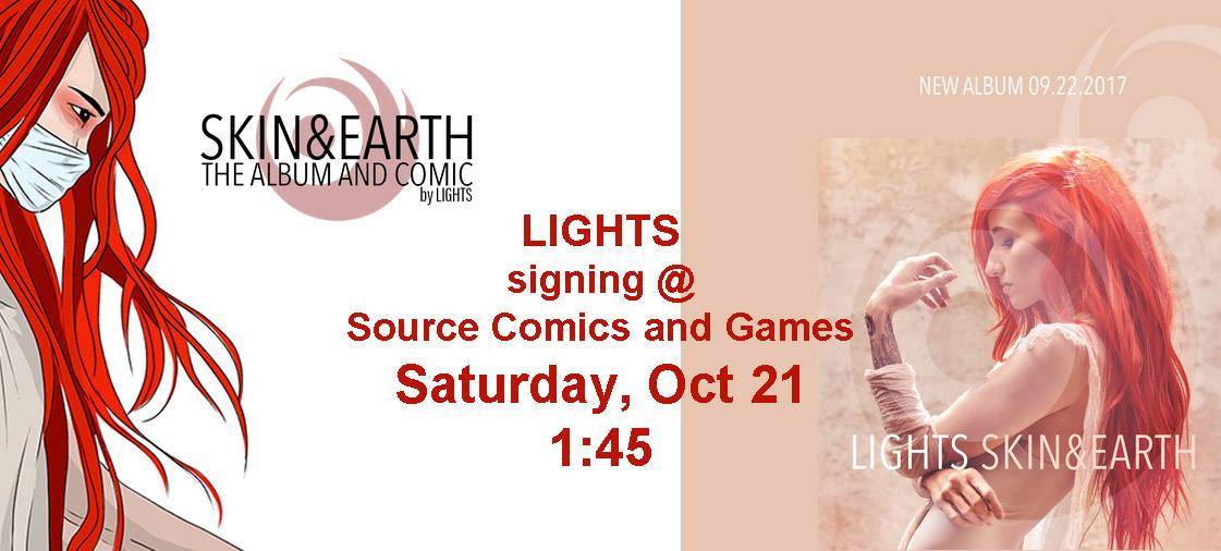 Canadian musician Lights appears at Source Comics & Games on Saturday, October 21st at 1:45 PM to sign both the comic and album of Skin & Earth.