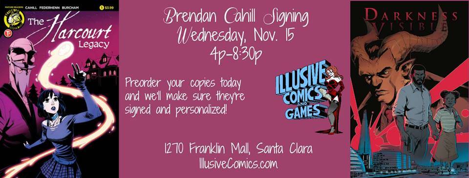 Brendan Cahill, writer of Harcourt Legacy and artist of Darkness Visible, signs at Illusive Comics and Games on Wednesday, November 15th at 4:00 PM.