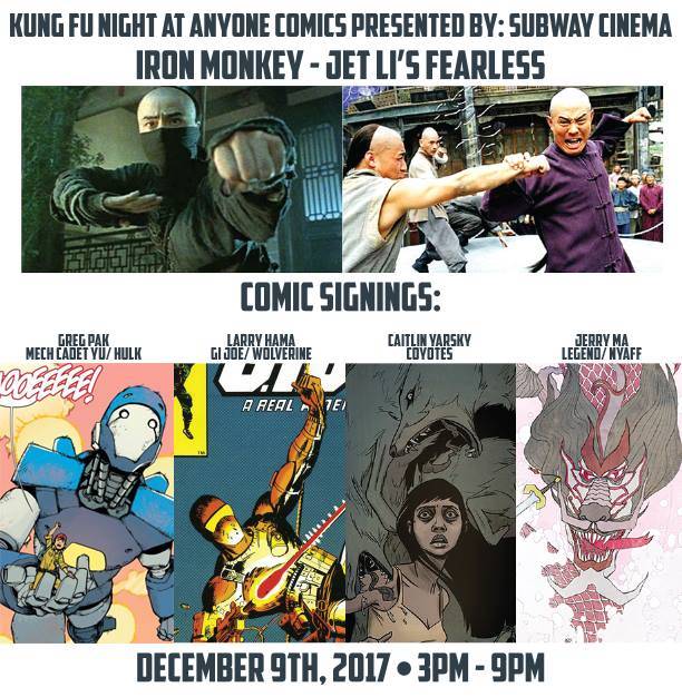 Larry Hama (GI Joe), Greg Pak (Totally Awesome Hulk), Caitlin Yarsky (Coyotes), and Jerry Ma (Legend) sign at Anyone Comics on Saturday, December 9th at 5:00 PM. The shop will also be screening kung fu classics Iron Monkey and Fearless.