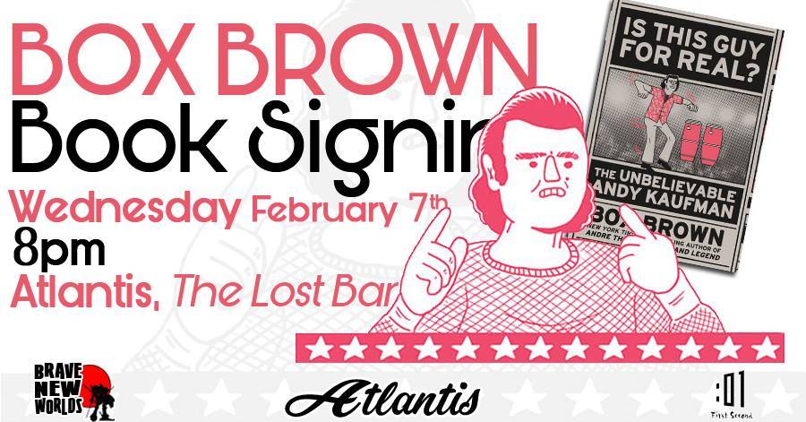 Cartoonist Box Brown appears at the Lost Bar on Wednesday, February 7, 2018 at 8:00 PM to celebrate his latest graphic novel from First Second Books IS THIS GUY FOR REAL: THE UNBELIEVABLE ANDY KAUFMAN. Presented by Brave New Worlds.