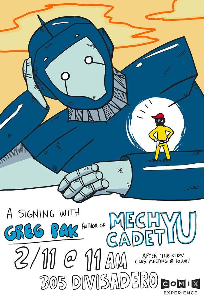 Writer Greg Pak (PLANET HULK, WEAPON X) will be at Comix Experience on Sunday, February 11th, at 11:00 AM to sign his new all-ages comic MECH CADET YU! Perfect for fans of Pacific Rim and The Iron Giant, Mech Cadet Yu is filled with action, adventure, and heart, and we can’t wait to talk to Greg all about it at our Graphic Novel of the Month Kids’ Club meeting!