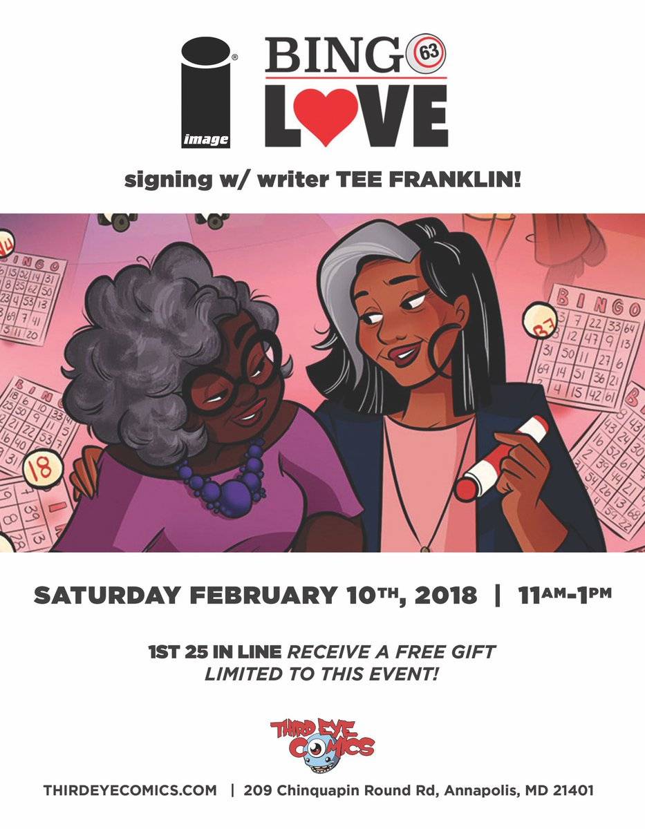 Tee Franklin, creator and writer of Bingo Love, appears at Third Eye Comics on Saturday, February 10th from 11:00 AM – 1:00 PM for a signing!