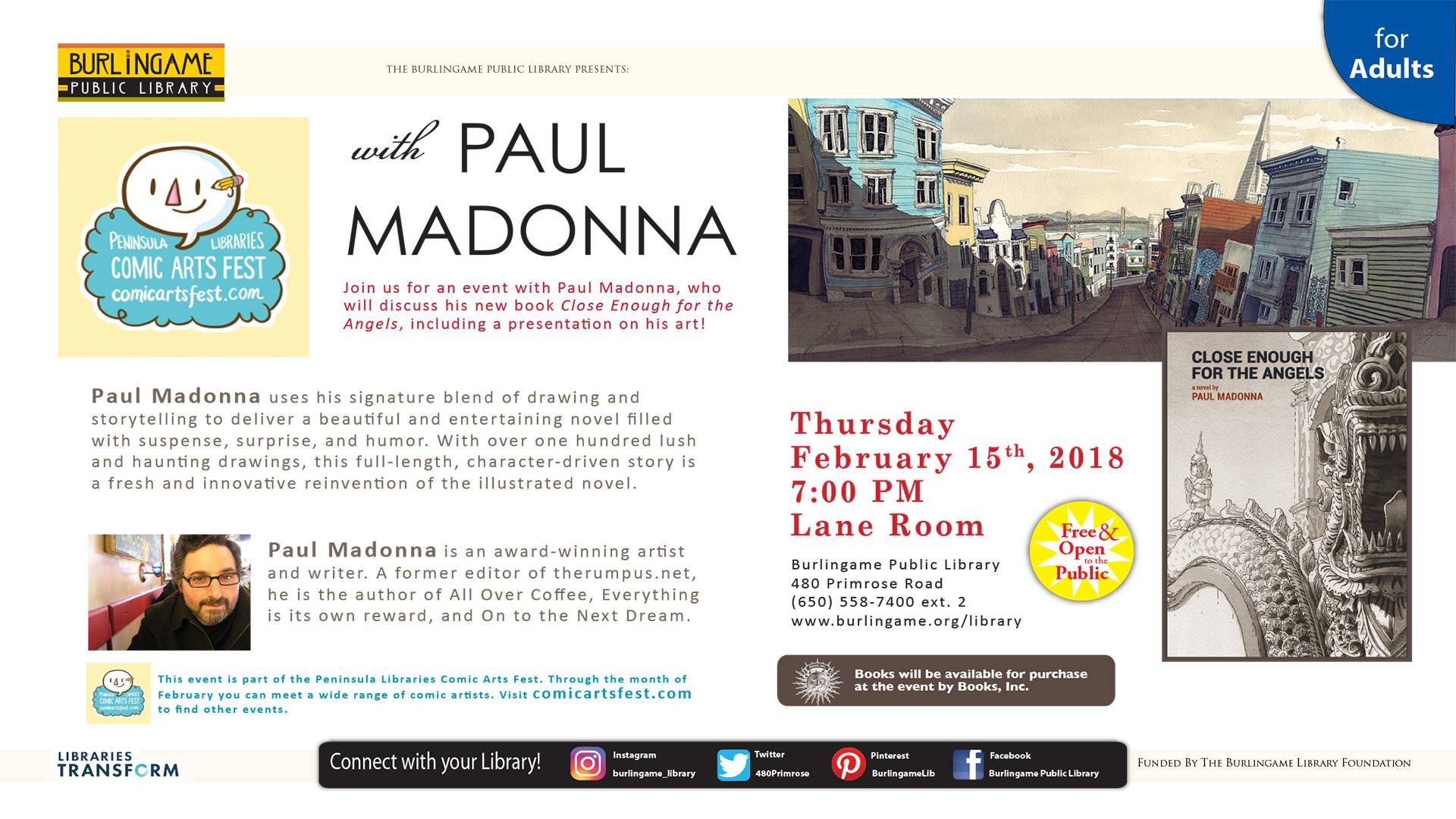 Join the Burlingame Public Library for an event with Paul Madonna, who will discuss his new book Close Enough for the Angels, along with a presentation of images on Thursday, February 15, 2018 at 7:00 PM. Paul Madonna uses his signature blend of drawing and storytelling to deliver a beautiful and entertaining novel filled with suspense, surprise, and humor. With over one hundred lush and haunting drawings, this full-length, character-driven story is a fresh and innovative reinvention of the illustrated novel. Books will be available for purchase from Books Inc. at the event.