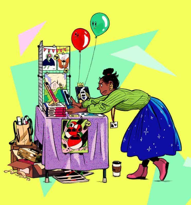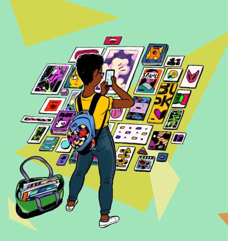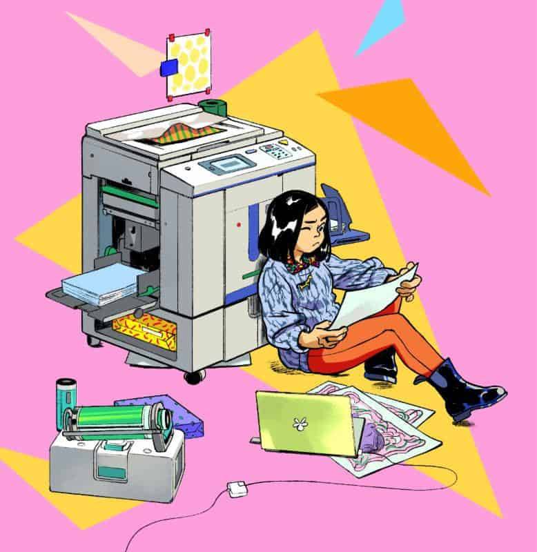 Mock’s colorful, detailed badge art imagery describes “festival life”, with characters busily preparing for the Fest: Printing on a risograph, working at an artist’s desk, instagramming “haul”, transporting merchandise to the Fest, and setting up a festival booth. Follow the Society’s instagram (@soi128) to see the complete set, plus a special animated illustration create by Mock!