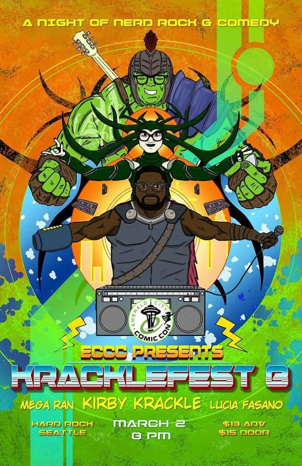 Emerald City Comic Con and nerd-rock artist Kirby Krackle are proud to present KRACKLEFEST 8 – A Night Of Nerd-Rock & Comedy taking place at Hard Rock Seattle on Friday, March 2nd only a few blocks from the con!