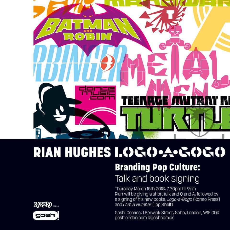 Rian Hughes appears at Gosh Comics on Thursday, March 15th at 7:30 PM for s short presentation and Q & A, followed by a signing of his new books Logo-a-Gogo (Korero Press) and I Am A Number (Top Shelf).