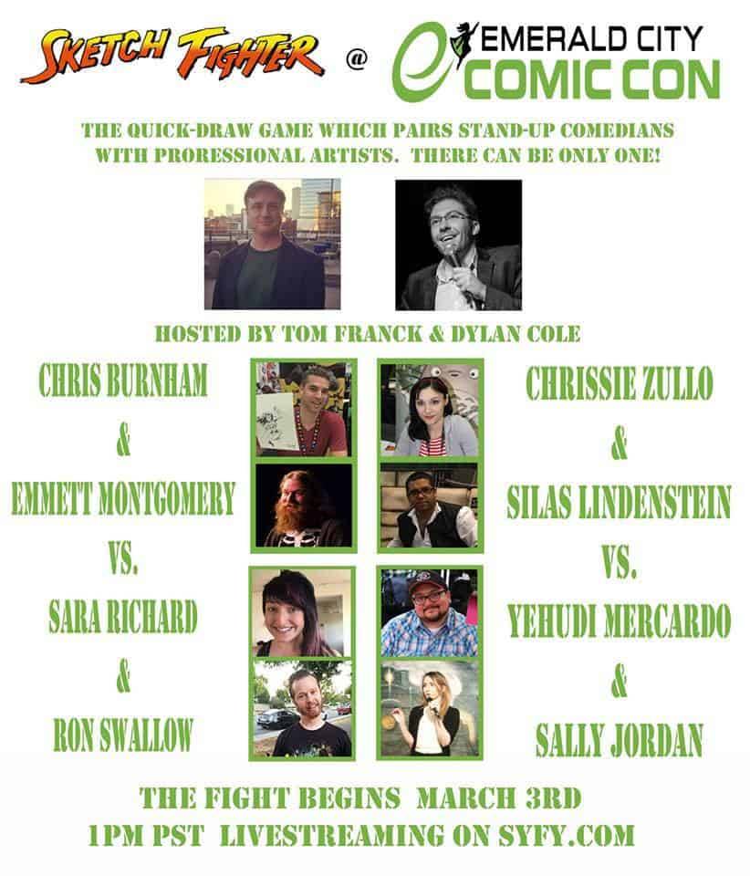 The quick-draw game that pairs comic book artists with stand-up comedians returns to the Emerald City Comic Con. On March 3rd at 1PM PST, four teams will compete on the floor of ECCC, with only one emerging victorious.
