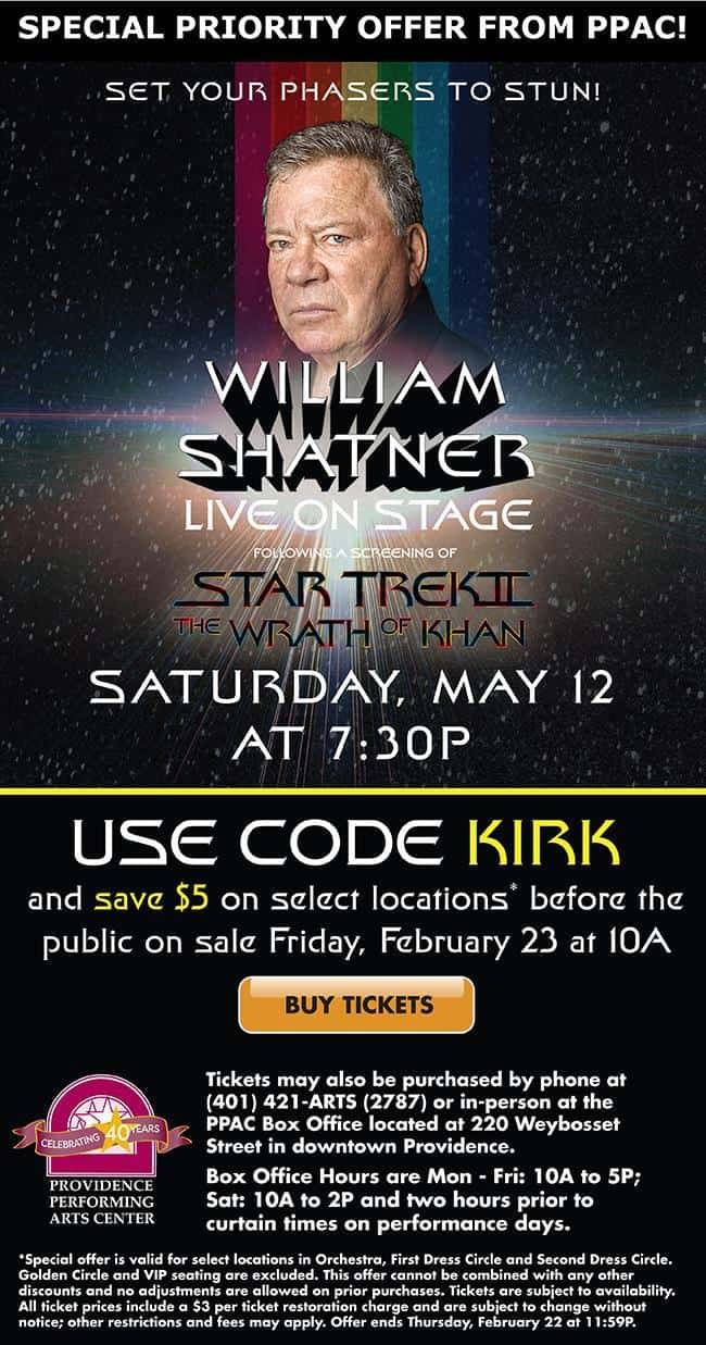 Home United States Rhode Island William Shatner LIVE in Providence! United StatesRhode IslandDirectorySigning and Appearance ProfilesCategoryScience Fiction and FantasyTelevision William Shatner LIVE in Providence! By Joe Fauvel - February 20, 2018 194 0 FacebookTwitterPinterestWhatsApp Boldly go and check out this exciting event coming to the Providence Performing Arts Center on Saturday, May 12th, 2018 at 7:30pm! Direct Link to tickets HERE! Image already added