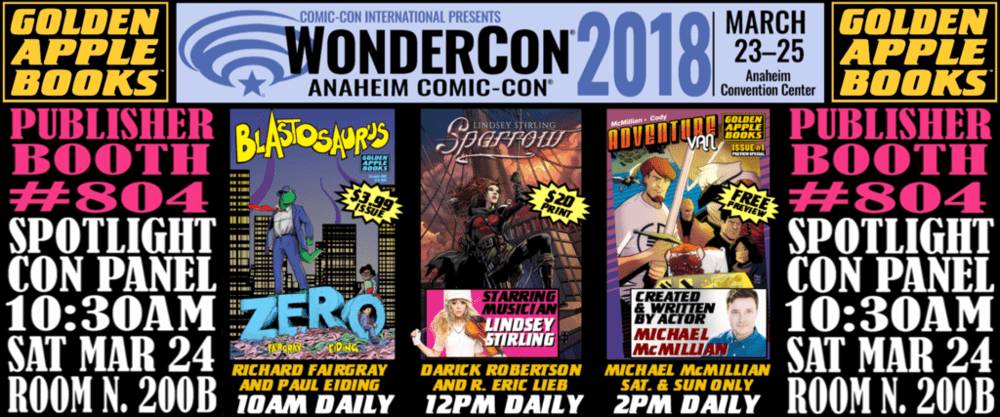 Golden Apple Books, a new comic publishing extension of Golden Apple Comics, will debut three new titles this year, you can hear about all of it and meet our creators at WonderCon Anaheim on March 23-25 at booth #804. Also, don’t miss our spotlight panel Saturday, March 24th from 10:00 -11:30 AM in Room North 200B.