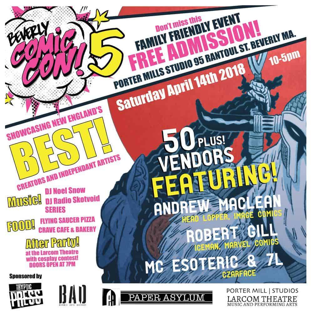 Join us on Saturday, April 14th for the fifth annual Beverly Comic Con hosted at Porter Mill Studios! Free to the public, family friendly and jam packed with local comic creators and unique vendors. Original art, posters, prints, handmade collectibles, t-shirts, graphic novels and of course comic books, will all be on hand for this one of a kind event. RSVP on Facebook!