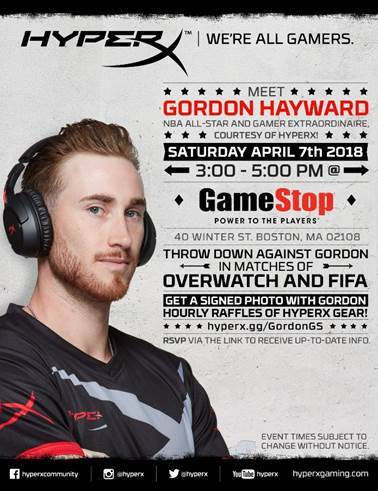 On the same weekend, Gordon Hayward of the Boston Celtics and HyperX brand ambassador will be attending a HyperX fan appreciation event at Gamestop Downtown Boston. Fans will have the opportunity to meet, take a picture or play Overwatch and FIFA against Gordon. The event will be held at the Gamestop Downtown store on Saturday, April 7th between 3:00 to 5:00 PM at 40 Winter Street. Entry into the event will be first come, first served and HyperX products will be available for fans to try out. Some of the gaming headsets available will include the HyperX Cloud II, Cloud Alpha and the newest family member, the wireless Cloud Flight with up to 30 hours of battery life. For more information on this fan event, go to the Facebook event page…