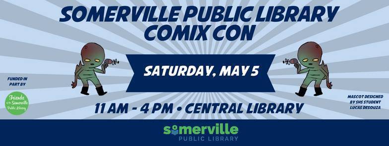 The Somerville Public Library Comix Con will take over the Central Library on May 5th from 11 AM to 4 PM! Comix Con is an all-ages celebration of fandom, combining the worlds of film and television, science fiction, fantasy, comic books, graphic novels, anime, books, cartoons, gaming, and collectibles.