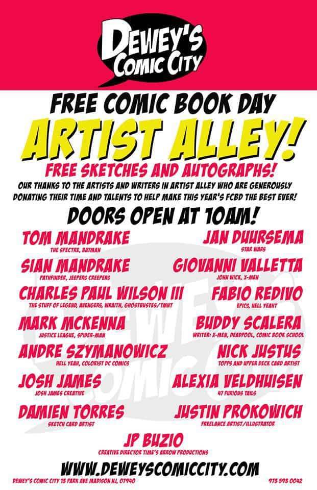 Comic creators Jan Duursema, Tom Mandrake, Sian Mandrake, Giovanni Valletta, Charles Paul Wilson III, Fabio Redivo, Mark McKenna, Buddy Scalera, Andre Szymanowicz, Nick Justus, Josh James, Alexia Veldhuisen, Damien Torres, Justin Prokowich, and JP Buzio appear at Dewey’s Comic City on Saturday, May 5th to celebrate Free Comic Book Day!