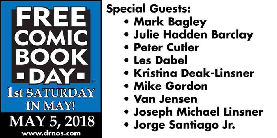 Dr. No’s celebrates Free Comic Book Day on Saturday, May 5th with special guests Mark Bagley, Julie Hadden Barclay, Peter Cutler, Les Dabel, Kristina Deak-Linsner, Mike Gordon, Van Jensen, JM Linsner, Dean Motter, and Jorge Santiago Jr.! (Signing: 12:30 until 2:00 PM)