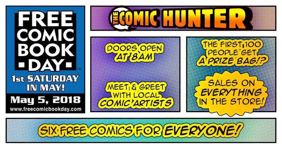 Nick Bradshaw, Danica Brine, Larry Higgins, Adam Atkinson, Nathan Salmon, Devin Taylor, Samantha Branch, Andre-Guy Landry, and Paul Bertin appear at The Comic Hunter on Saturday May 5, 2018 to celebrate Free Comic Book Day!