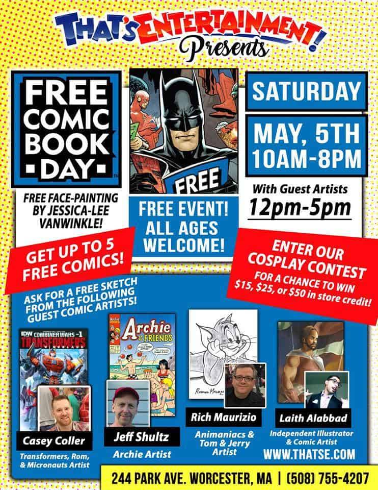 Eisner-award-winning pop culture store That’s Entertainment, located at 244 Park Ave. Worcester, MA, will be celebrating Free Comic Book Day on Saturday, May 5th by giving out free comic books all day (10:00 a.m. to 8:00 p.m.) to children and adults of all ages. There will be a wide variety of comics to choose from, ranging from kid-friendly to 18+. Each attendee will be able to choose five free comic books from a variety of Free Comic Book Day exclusive comic books. This is a first-come, first-served event. Free comics will be plentiful, but quantities on select titles may be limited. Additionally, visiting professional comic artists will be drawing and giving away free mini-sketches of superheroes, and other comic related characters, upon request from noon to 5:00 p.m.