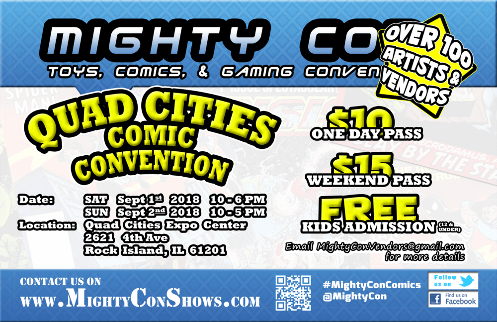 | Good news, everyone! Festival season in The Quad Cities is kicking off this year with an amazing comic convention! This September 1st & 2nd, Mighty Con is taking over the Quad Cities Expo Center in Rock Island, IL. The Quad Cities Comic Con will feature over 300 artist tables, vendor booths, and special guests. But we’re also bringing cash prize cosplay contests, video and table top gaming tournaments, and a whole weekend of fun! The Quad Cities’s largest comic book and pop culture event! | |