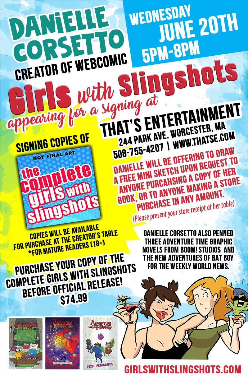Danielle Corsetto, creator of webcomic Girls With Slingshots, will be appearing at That’s Entertainment in Worcester, MA on Wednesday, June 20th from 5:00 p.m. to 8:00 p.m. for an in-store signing.