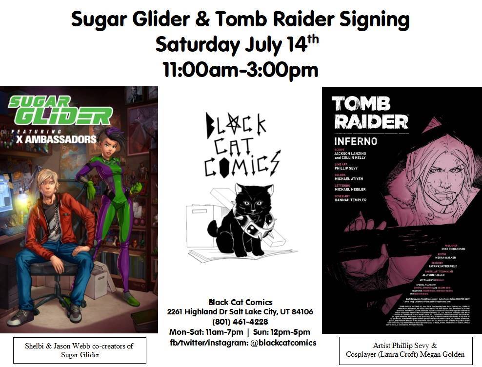 Shelbi and Jason Webb, Utah locals and co-creators of Sugar Glider, Phillip Sevy, artist of Tomb Raider: Inferno, and cosplayer Megan Golden sign at Black Cat Comics on Saturday, July 14th from 11:00 AM – 3:00 PM.