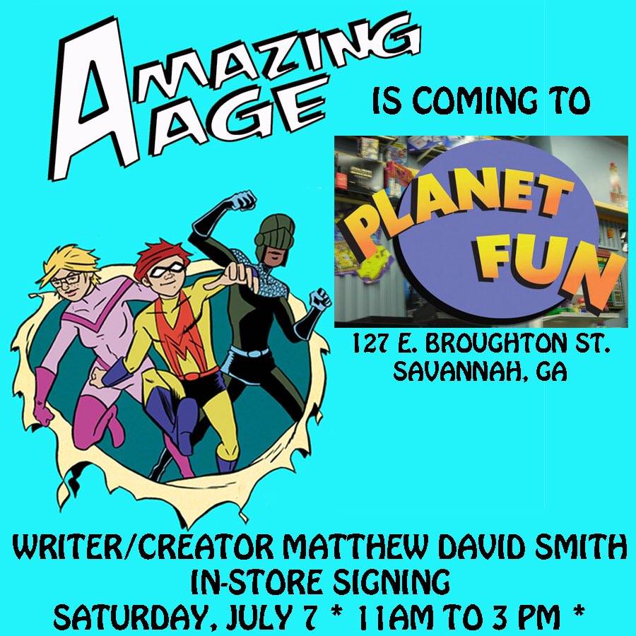 Amazing Age writer/creator Matthew David Smith will be at Planet Fun in Savannah, GA on Saturday, July 7th from 11 AM to 3 PM!