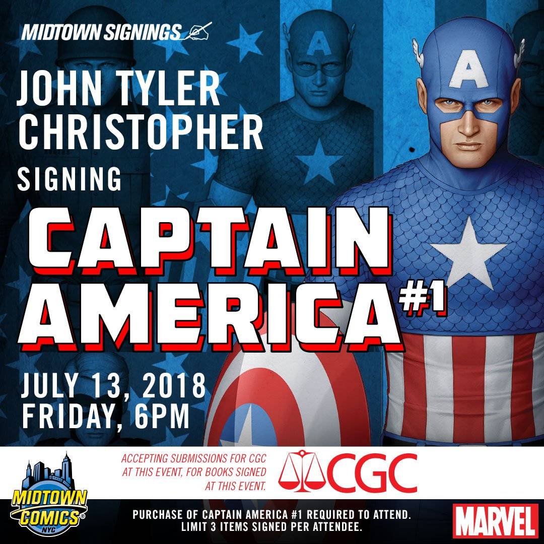 Artist John Tyler Christopher joins us at Midtown Comics Downtown on Friday, July 13th at 6:00 PM to celebrate the release of the Midtown Comics Exclusive cover for Captain America #1! This is an open signing and we recommend showing up early, just to be safe. Purchase of Captain America #1 required. Limit 3 items signed per attendee. See you there!