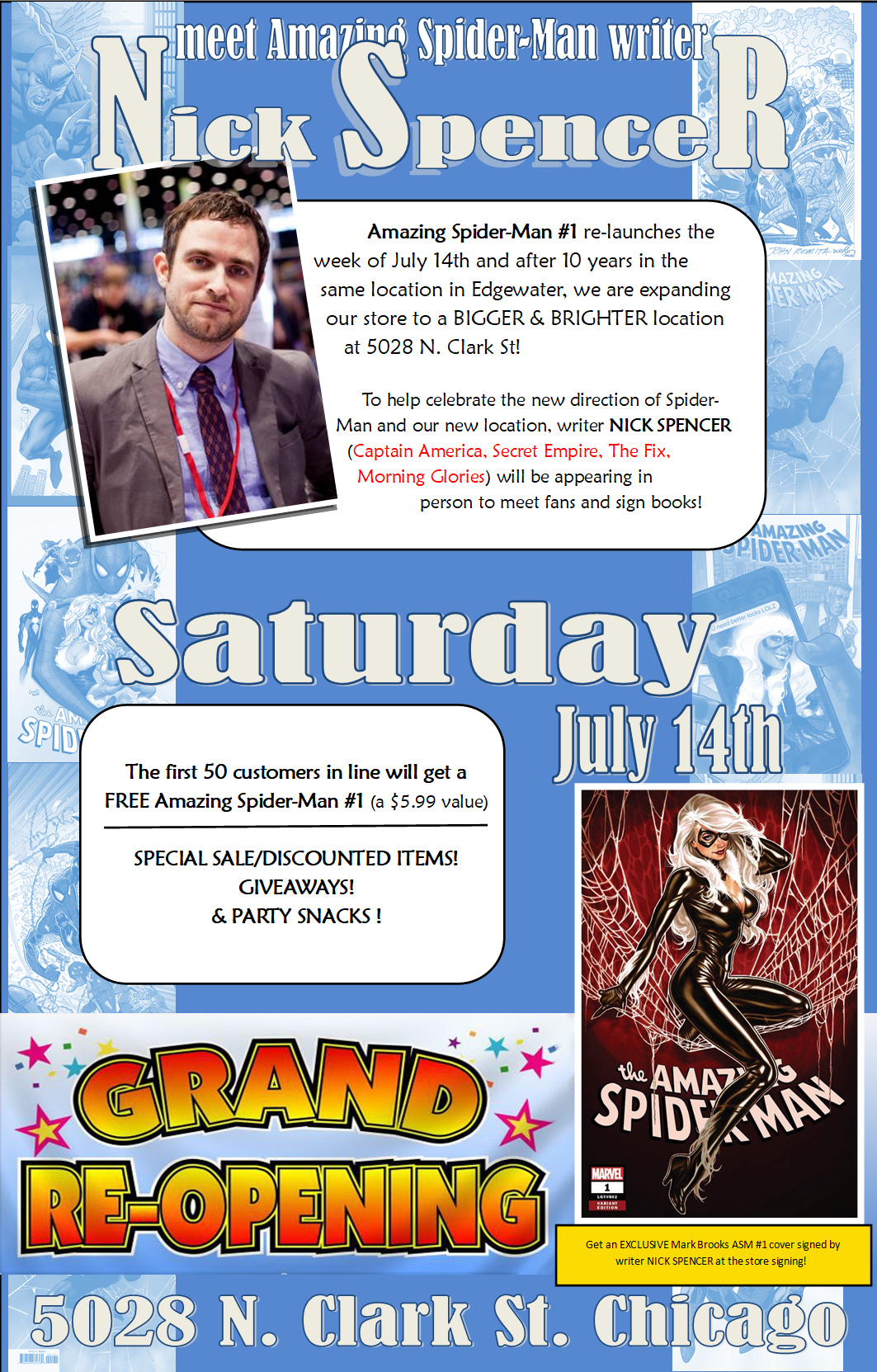Writer Nick Spencer (Captain America, Secret Empire, The Fix, Superior Foes of Spider-Man, Morning Glories) appears at Graham Crackers Comics’ Edgewater location to celebrate the re-launch of AMAZING SPIDER-MAN and the shop’s grand re-opening on Saturday, July 14, 2018 from 11 AM – 6 PM! The first 50 customers in line will receive a FREE copy of Amazing Spider-Man #1!