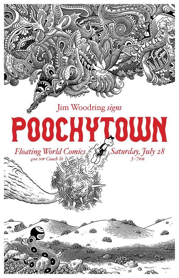 Cartoonist Jim Woodring is coming to Floating World Comics on Saturday, July 28th at 5:00 PM to celebrate the release of his latest graphic novel – Poochytown.