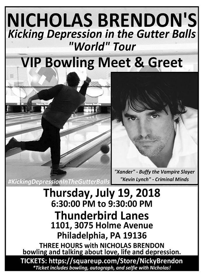 Nicholas Brendon (“Xander” – Buffy the Vampire Slayer, “Kevin Lynch” – Criminal Minds) appears at Thunderbird Lanes on Thursday, July 19, 2018 from 6:30 – 9:30 PM for bowling and talking about love, life and depression.