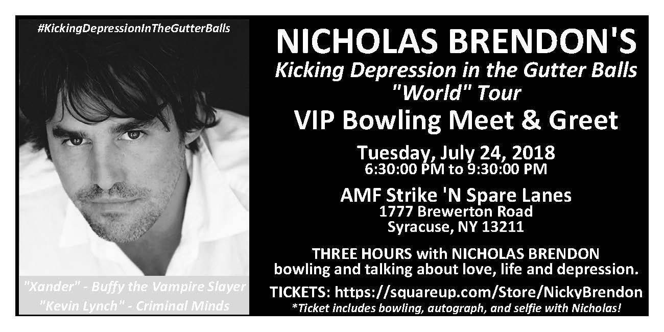 Nicholas Brendon (“Xander” – Buffy the Vampire Slayer, “Kevin Lynch” – Criminal Minds) appears at AMF Strike ‘N Spare Lanes on Tuesday, July 24, 2018 from 6:30 – 9:30 PM for bowling and talking about love, life and depression.
