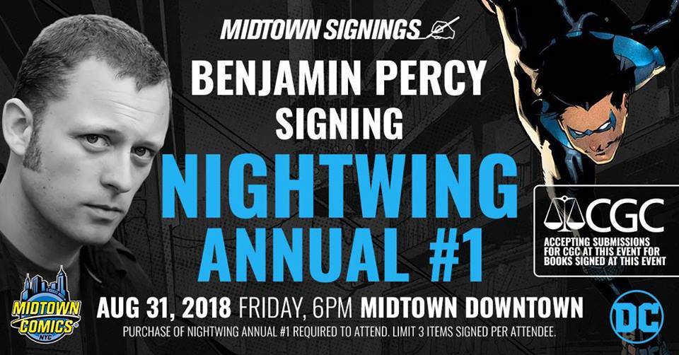 Writer Benjamin Percy (Detective Comics, Green Arrow, Teen Titans) appears at Midtown Comics Downtown on Friday, August 31st at 6:00 PM to celebrate the release of Nightwing Annual #1! This is an open signing and we recommend showing up early, just to be safe. Purchase of Nightwing Annual #1 required. Limit 3 items signed per attendee. See you there!