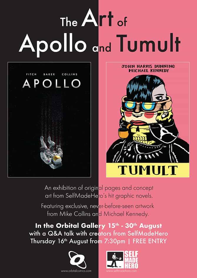 In celebration of their latest hit graphic novels, we’ve teamed up with independent comics publisher SelfMadeHero! In the Orbital Gallery from August 15-30th, we’ll be hosting an exclusive exhibition of artwork by Mike Collins for Apollo, and by Michael Kennedy for Tumult.