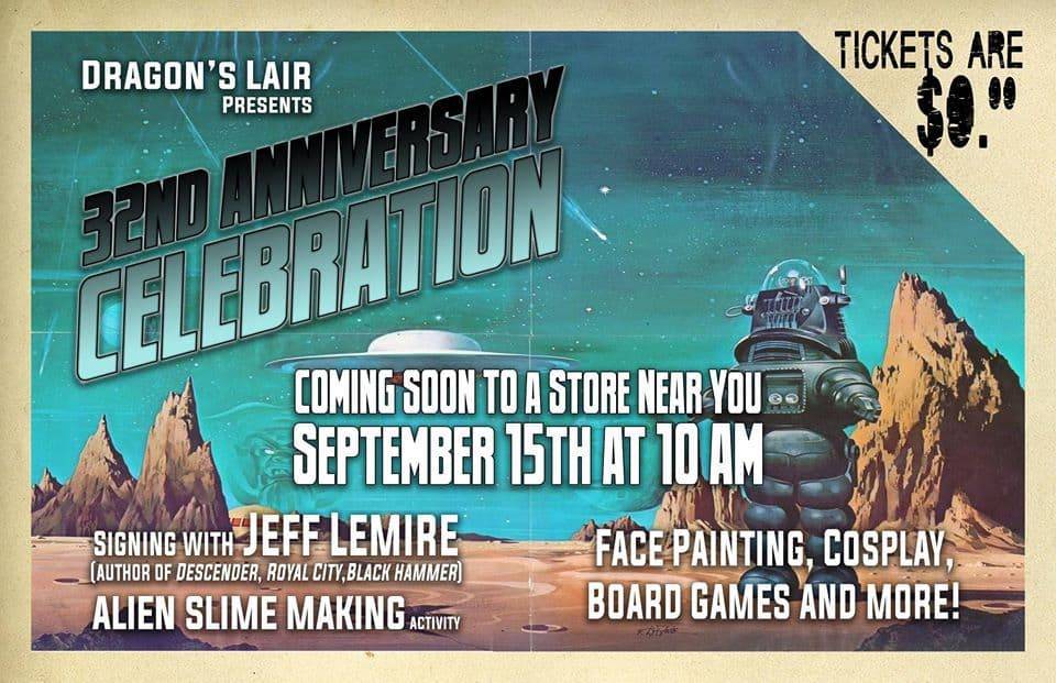 Jeff Lemire (writer for Royal City, Descender, Black Hammer) appears at Dragon’s Lair on Saturday, September 15, 2018 to help the shop celebrate their 32nd Anniversary! There will be as well as a slew of fun activities such as facepainting, alien slime making, cosplayers, board game demoes and more!