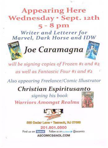 Joe Caramagna (Frozen, DuckTales) and Christian Espiritusanto (Warriors Amongst Realms) sign at A&S Comics on Wednesday, September 12 at 5 PM.