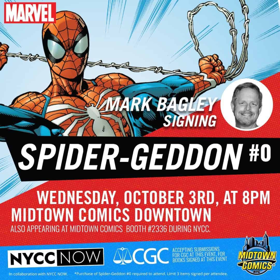 Artist Mark Bagley (Amazing Spider-Man, All-New X-Men, Thunderbolts) joins us from Midtown Comics Downtown on Wednesday, October 3rd at 8 PM to celebrate the release of Spider-Geddon #0! This is an open signing and we recommend showing up early, just to be safe. Purchase of Spider-Geddon #0 required. Limit 3 items signed per attendee.