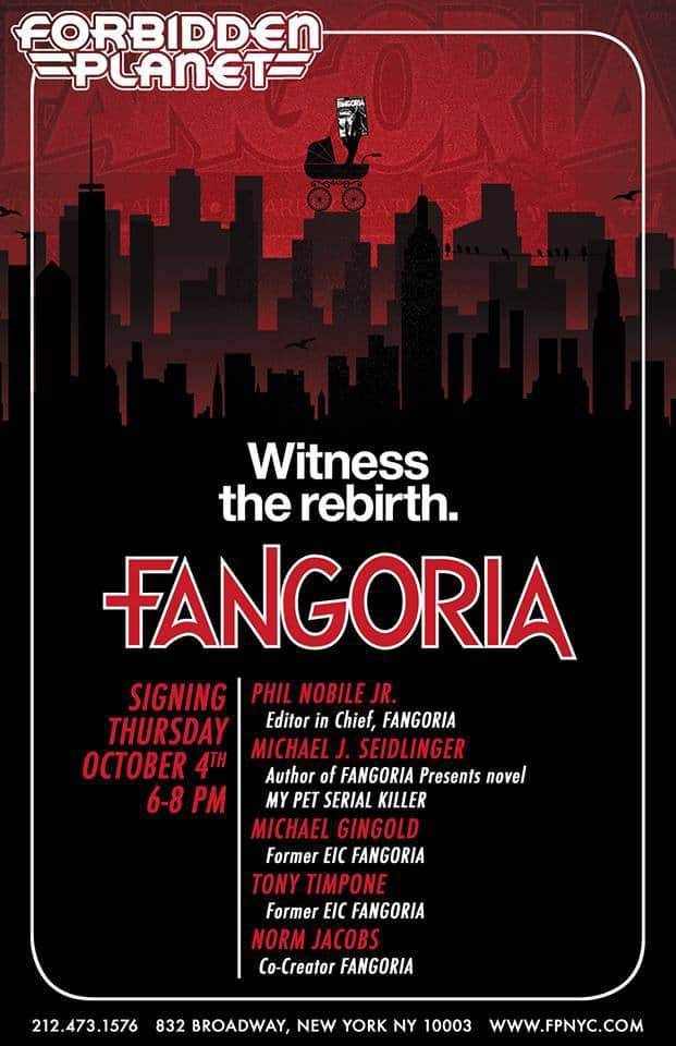 FANGORIA is back! Come celebrate the rebirth of the magazine at famed NYC comic store Forbidden Planet! Come meet Fango legends Norm Jacobs, Tony Timpone, Michael Gingold, Phil Nobile Jr., and Michael J. Seidlinger and get your copy of our first new issue on Thursday, October 4th at 6 PM! Witness the rebirth and have a bloody good time!