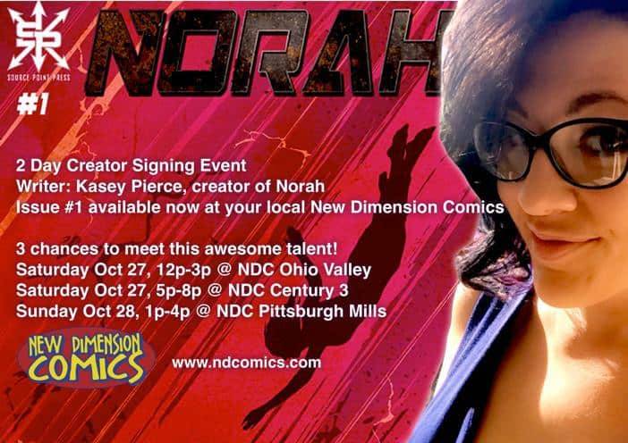 Kasey Pierce, creator of NORAH from Source Point Press, will be signing at three New Dimension Comics locations: