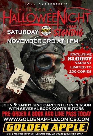 The horror master John Carpenter and his queen and Sandy King Carpenter return to Golden Apple Comics on Saturday November 3rd at 1:00 PM. They are bringing contributors to John Carpenter’s Tales for a Halloween Night Vol 4 to sign an exclusive “Bloody” variant edition by Tim Bradstreet. Deserve your book and line pass today online at the website.