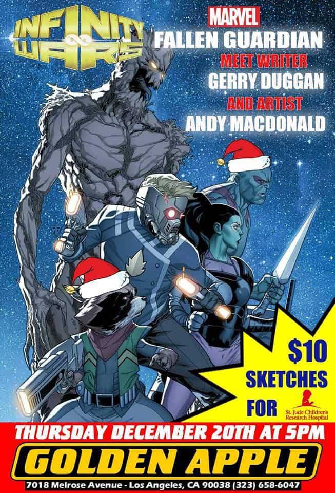 Writer Gerry Duggan and artist Andy MacDonald appear at Golden Apple Comics on Thursday, December 20, 2018 at 5 PM to sign Infinity Wars Fallen Guardian from Marvel Comics.