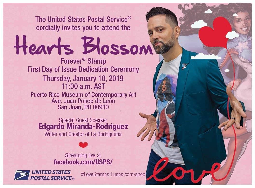 Edgardo Miranda-Rodriguez, writer/creator of La Borinqueña, appears on Thursday, January 10, 2019 at 11 AM for the Hearts Blossom, The United State Postal Service Dedication Ceremony for 2019 Forever® Stamp dedication. Watch the live stream at www.facebook.com/USPS