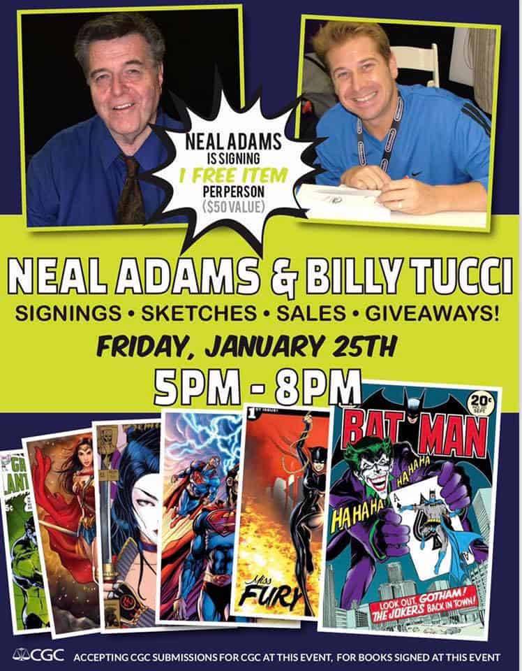 Neal Adams and Billy Tucci sign at Comic Spot on Friday, January 25, 2019 from 5 PM – 8 PM.