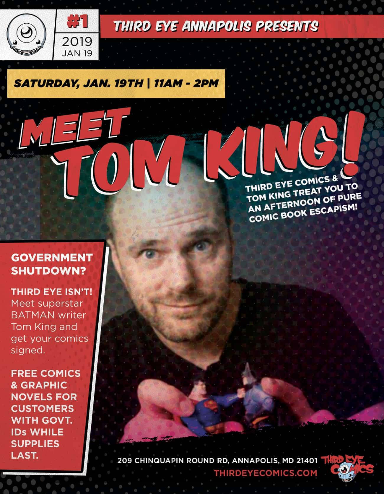 Government Shutdown got you down? Tom King & Third Eye are treating you to a Saturday of fun! Get a FREE DC Comics graphic novel or comic when you show government ID! Signing Open to All!