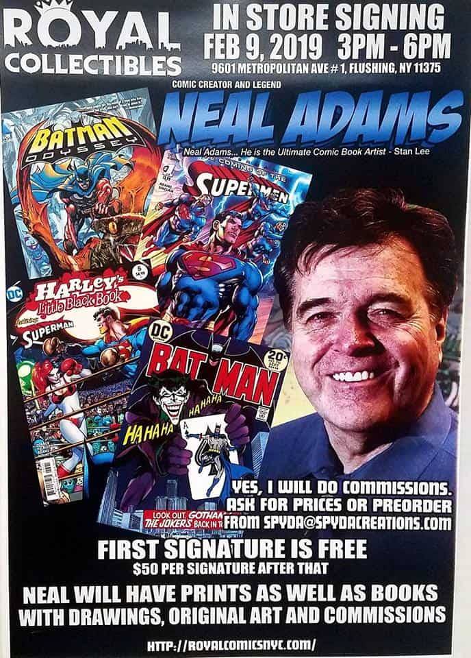Neal Adams signs at Royal Collectibles on Saturday, February 9, 2019 from 3:00 till 6:00 PM.