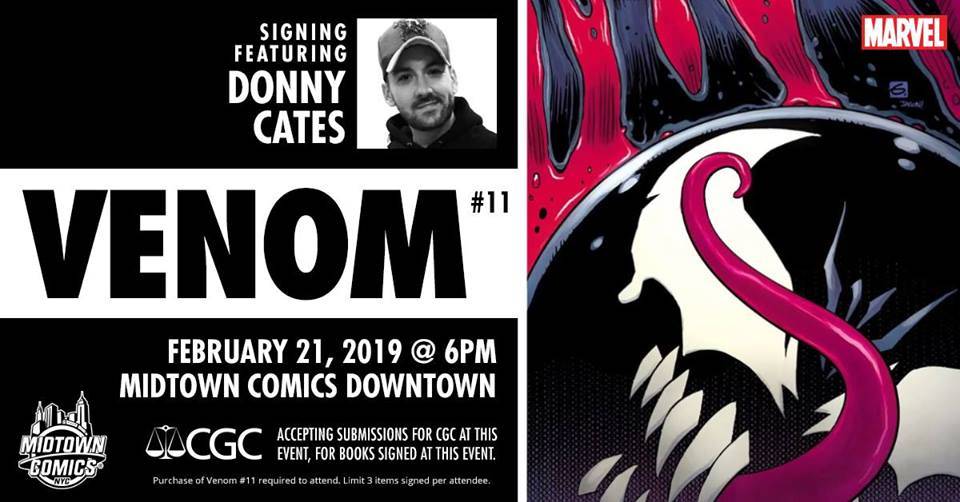 Writer Donny Cates (Guardians of the Galaxy, Cosmic Ghost Rider, Thanos, Redneck, God Country, The Paybacks) appears at Midtown Comics Downtown on Thursday, February 21st at 6:00 PM to celebrate the release of Venom #11! This is an open signing and we recommend showing up early, just to be safe. Purchase of Venom #11 required. Limit 3 items signed per attendee.