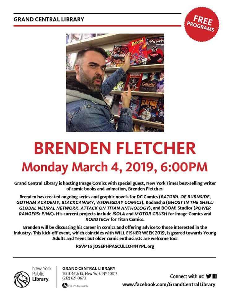Grand Central Library hosts Image Comics with special guest, New York Times best-selling writer of comic books and animation, Brenden Fletcher, on Monday, March 4, 2019 at 6:00 PM.