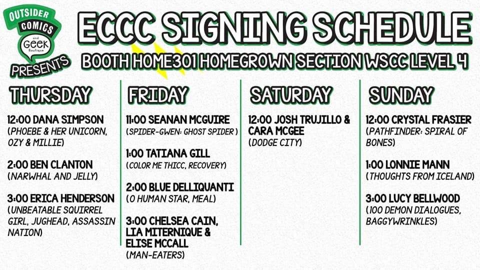 We also have a number of exciting comic creators scheduled for signings! Find the schedule listed below or in the graphic above.