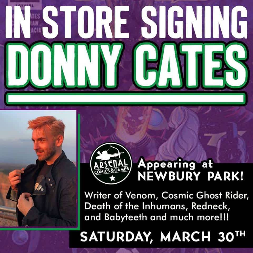Donny Cates (writer of Venom, Thanos, Guardians of the Galaxy, Cosmic Ghost Rider, Death of The Inhumans, Babyteeth, Redneck, God Country, and more) appears at Arsenal Comics on Saturday, March 30, 2019 at 7 PM for a signing.