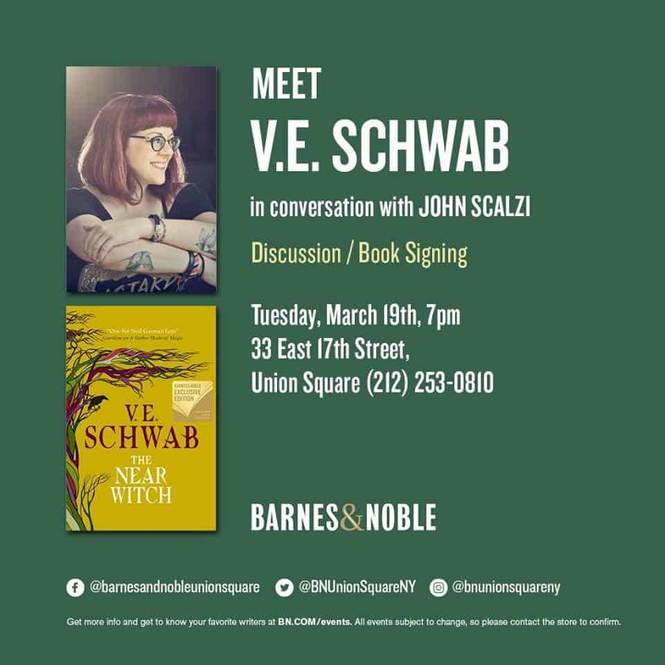 Join Barnes & Noble in welcoming V.E. Schwab, in conversation with John Scalzi, on Tuesday, March 19, 2019 at 7 PM to celebrate the release of B&N Exclusive Edition of The Near Witch! Wristbands for event access will be distributed with purchase of the featured title beginning at 9am the day of the event. Ms. Schwab will sign and personalize copies of her new book, as well as backlist titles. She will also pose for photos. Attendees may have up to TWO items personalized.